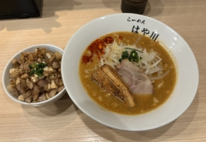 福岡の警固にある「ラーメンはや川」で晩ご飯を食べてきました。今日は少し寒かったこともあって、迷わず選んだのはみそラーメン(辛)とチャーシュー丼。福岡といえばやっぱりとんこつラーメンの街というイメージが強いですが、ここ数年は非とんこつ系のお店もどんどん増えていて、選択肢が広がっているのが嬉しいところです。その中でも「はや川」のみそラーメンは、何度食べても「やっぱり美味しいなあ」と思わせてくれる一杯です。